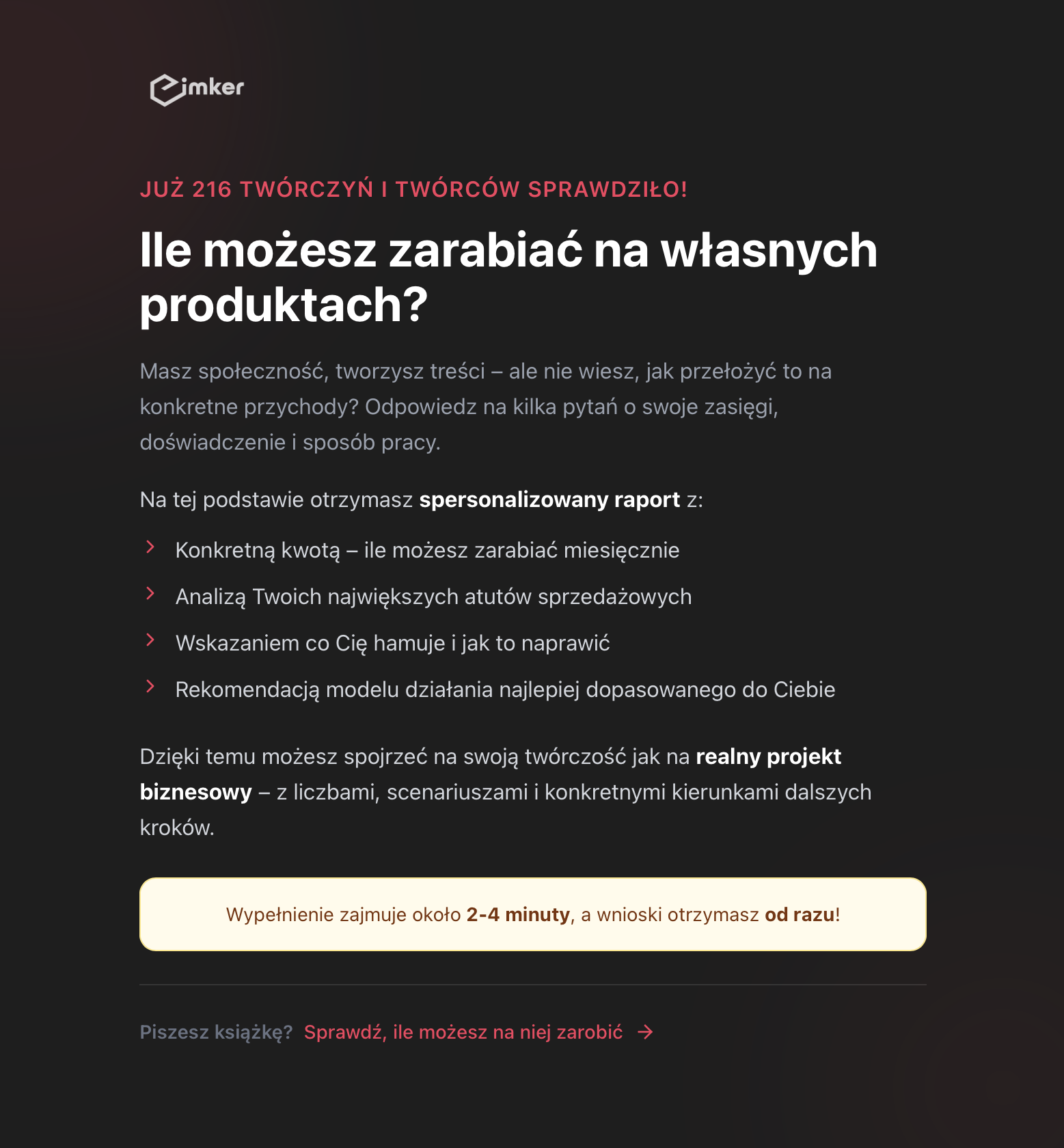 Zastanawiasz się, czy mógłbyś utrzymać się z działalności w internecie? Imker, firma wspierająca twórców we wprowadzaniu własnych produktów na rynek, stworzyła narzędzie, dzięki któremu twórcy internetowi mogą oszacować, ile zarabią sprzedając książki, merch czy kursy internetowe.