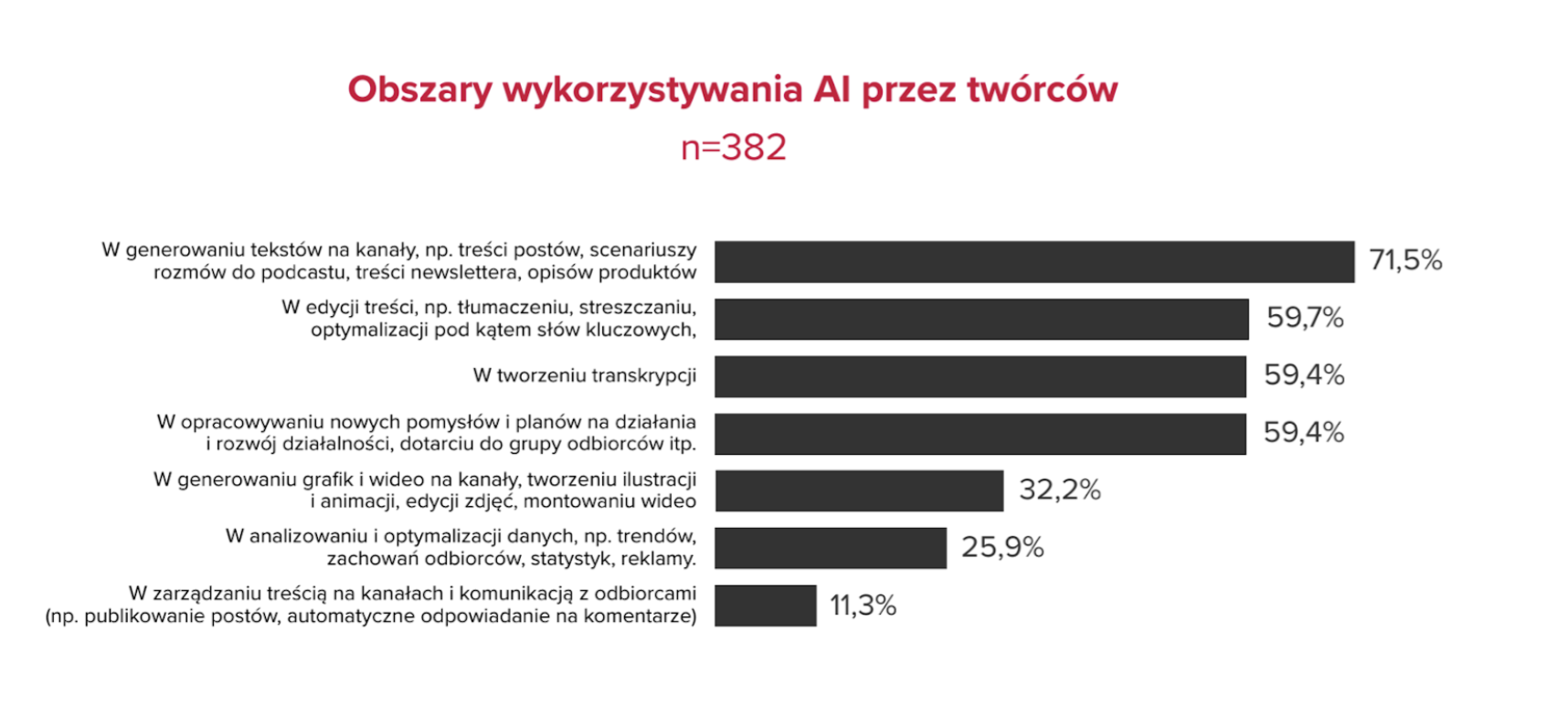 @lilmiquela, @fit_aitana czy @shudu.gram to tylko kilka przykładów wirtualnych influencerów, czyli postaci stworzonych przy użyciu AI. Choć śledzi je setki tysięcy osób i tego typu kont ciągle przybywa, to jednak nadal skrajne przypadki używania sztucznej inteligencji w branży. Twórcy najczęściej wykorzystują sztuczną inteligencję do tworzenia treści – postów, scenariuszy, newslettera – oraz szukania pomysłów na nowe materiały. Sztuczna inteligencja wspiera też w transkrypcji, analizie i edycji materiałów, odciążając twórców w najbardziej czasochłonnych etapach pracy. Rzadziej AI służy do generowania grafik, wideo czy analizy danych, a tylko 11 proc. badanych automatyzuje za pomocą AI publikację postów lub odpowiadanie na komentarze.