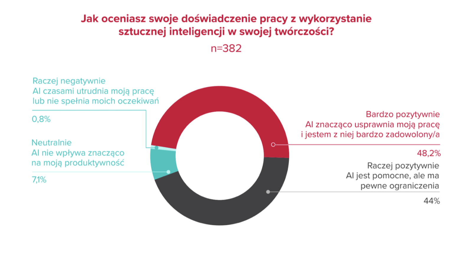 Według raportu KPMG w Polsce z AI korzysta się częściej niż w Niemczech, USA, czy na Węgrzech. Już 69 proc. respondentów z Polski regularnie korzysta ze sztucznej inteligencji – co najmniej raz na kilka miesięcy. Prawie 90 proc. użytkowników sięga po ogólnodostępne narzędzia AI w pracy, a aż 76 proc. zauważa wzrost wydajności pracy dzięki ich użyciu. Z badania Imker wynika, że twórcy nie tylko dotrzymują kroku temu trendowi – coraz częściej traktują AI jako stałe narzędzie swojej pracy.