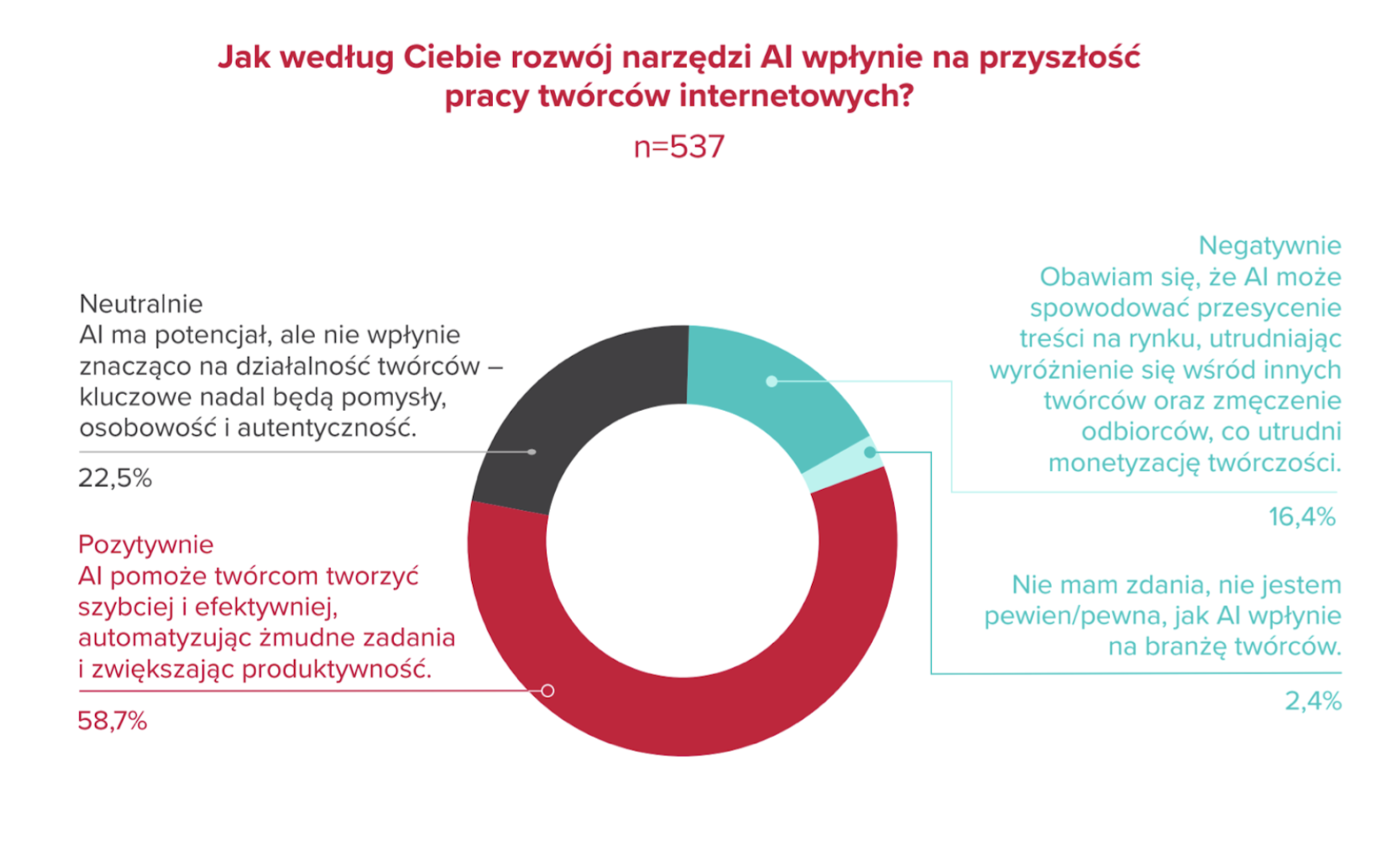 Niemal dwie trzecie ankietowanych jest przekonanych, że rozwój AI pozytywnie wpłynie na przyszłość pracy twórców — ułatwi im tworzenie, automatyzując monotonne, rutynowe zadania oraz zwiększając efektywność i produktywność. Oczywiście, pojawiają się też głosy sceptyczne: 16 proc. twórców wyraża obawy, że wykorzystanie sztucznej inteligencji może prowadzić do przesycenia rynku treści, co może negatywnie odbić się na monetyzacji ich działalności. Jednak takie opinie stanowią wyraźną mniejszość wśród społeczności twórców.