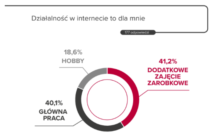 Działalność w internecie dla większości zapytanych twórców stanowi już nie tylko rodzaj zainteresowania, ale zajęcie zarobkowe. Dwóch na pięciu ankietowanych deklaruje, że twórczość internetowa jest ich główną pracą, dla kolejnych 40 proc. stanowi ona dodatkowe zajęcie, z którego czerpią przychody. Zaledwie co piąty respondent traktuje działalność online wyłącznie jako hobby.