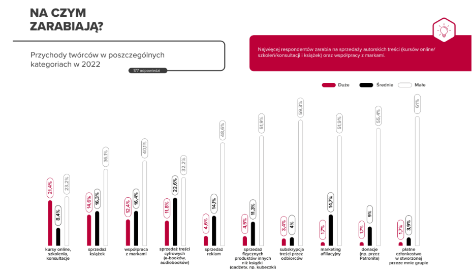 Przychody twórców zależne są od wybranych przez nich kanałów twórczości oraz sprzedawanych produktów. Najczęściej swoją działalność w internecie monetyzują YouTuberzy oraz twórcy prowadzący newsletter. Co drugi twórca, który wskazał je jako swoje główne kanały, zarabia ponad 10 tys. zł miesięcznie.