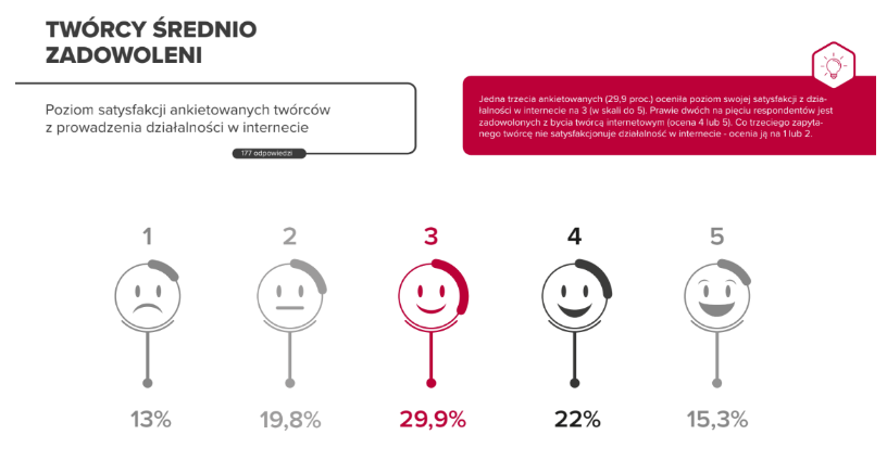 Ankietowani twórcy internetowi dość krytycznie podchodzą do oceny efektów swojej pracy i są z niej średnio zadowoleni. Jedna trzecia ankietowanych (29,9 proc.) oceniła poziom swojej satysfakcji na 3 (w skali do 5). Co trzeciego respondenta nie satysfakcjonuje działalność w internecie – ocenia ją na 1 lub 2. Bardzo podobna grupa twórców jest zadowolona ze swojego zajęcia.