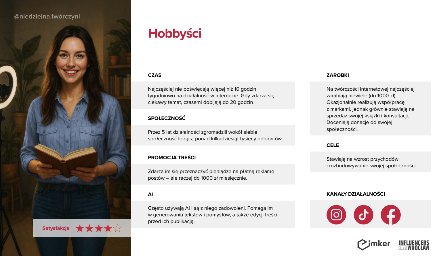 Po pracy wraca do domu, robi kolację i… odpala Instagrama – tak jak ponad połowa Hobbystów, dla których to właśnie tam toczy się twórcze życie. Tworzy wtedy, kiedy chce i o czym chce – bez narzuconych ram, terminów czy strategii. Jeśli jakiś temat go poruszy, potrafi poświęcić mu cały wieczór, jak 45 proc. innych twórców z tej kategorii. Zarobki? Może tysiąc złotych miesięcznie, czasem mniej, jak 13 proc., Hobbystów którym twórczość przynosi drobny, ale regularny dochód. Ale nie to się liczy a frajda z tworzenia. Gdy ma wenę, wydaje e-booka, testuje konsultacje, uruchamia promocję swoich treści – często z pomocą AI. Nie boi się inwestycji w reklamy – wręcz przeciwnie, wie, że 1000 zł na promocję może czasem dać więcej niż tydzień pracy. I choć należy do dwóch trzecich Hobbystów, którzy próbują sprzedaży własnego produktu, to nie robi tego z presją sukcesu – robi to z ciekawości. Twórczość traktuje jak eksperyment, nie obowiązek.