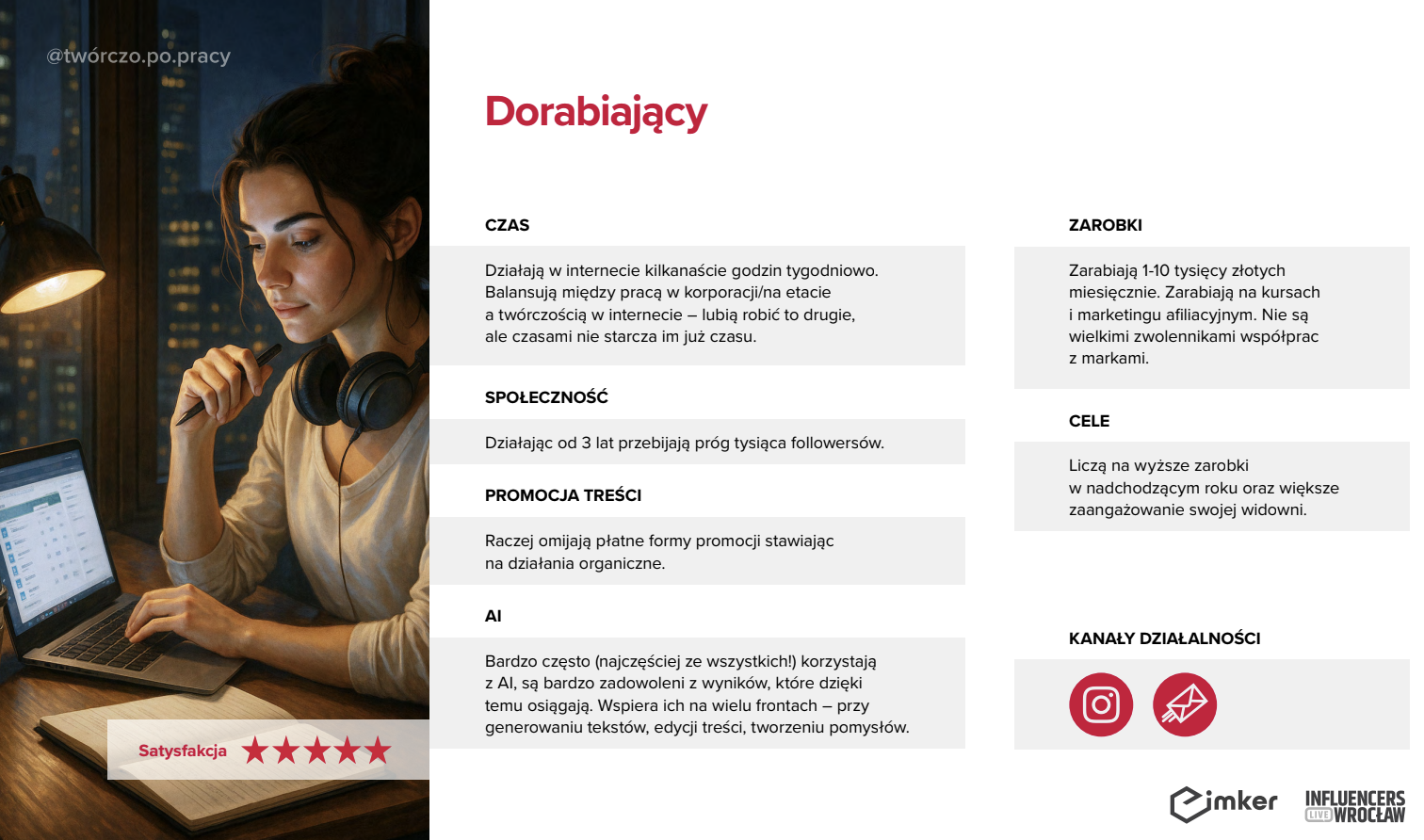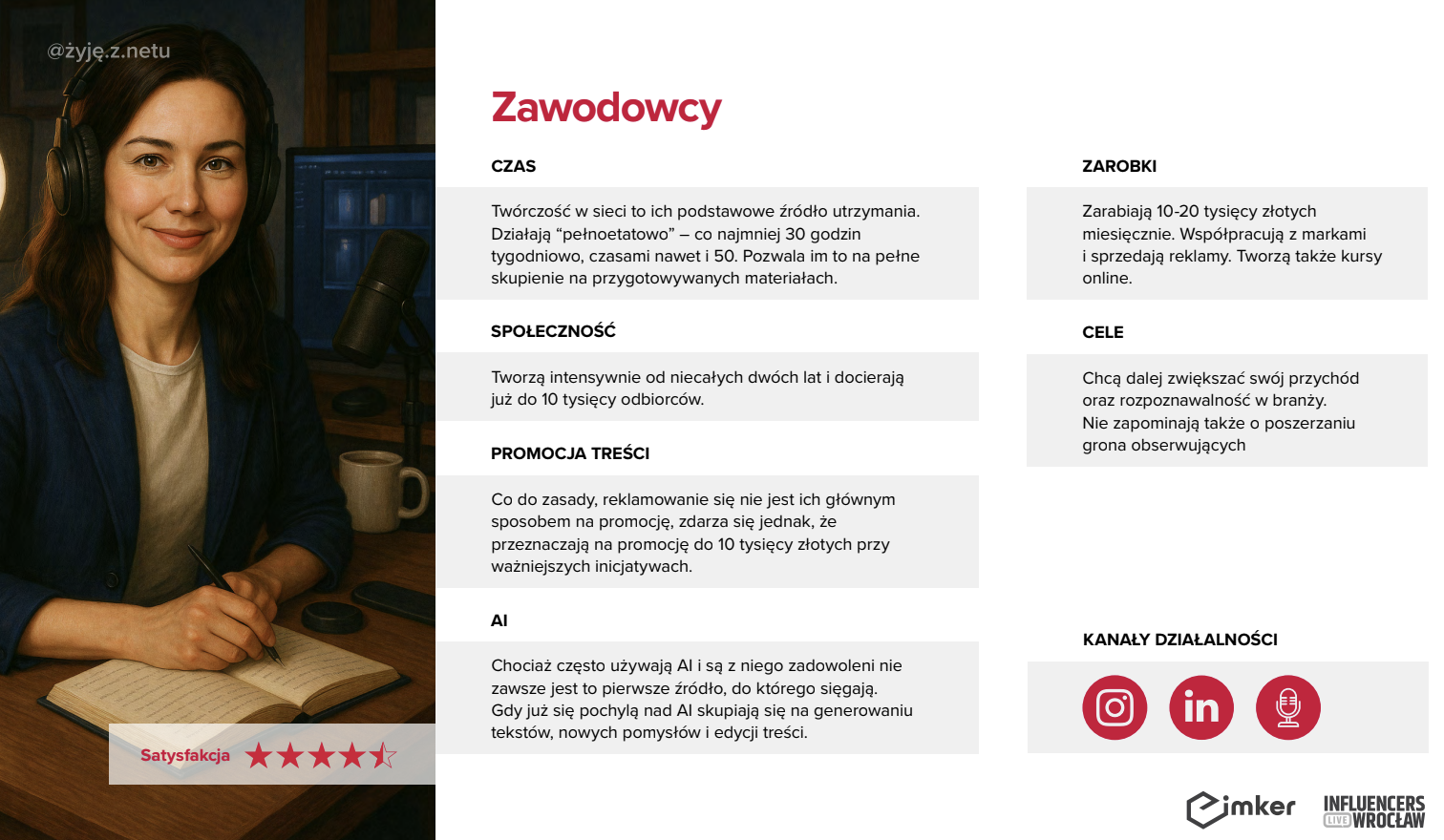 Podcast w poniedziałek, newsletter w środę, współpraca z marką w piątek. Zawodowiec działa w sieci jak szwajcarski zegarek, ale nie dlatego, że musi – tylko dlatego, że to jego życie. Spędza w sieci od 40 do nawet 50 godzin tygodniowo, jak jedna trzecia Zawodowców, którzy traktują swoją obecność online jak pełnoetatową pracę. Zarabia ponad 10 tysięcy miesięcznie, tak jak 43 proc. jego grupy, ale nadal czuje, że wyższe dochody dopiero przed nim. Myśli strategicznie, rozwija biznes, ale też zmaga się z wypaleniem i presją. Mimo tego, że 46 proc. Zawodowców ocenia satysfakcję ze swojej działalności wysoko, co piąty jest z niej niezadowolony. Tworzy, bo czuje, że jego praca ma sens. AI to dla niego narzędzie użyteczne, ale nie zastępuje procesu twórczego.