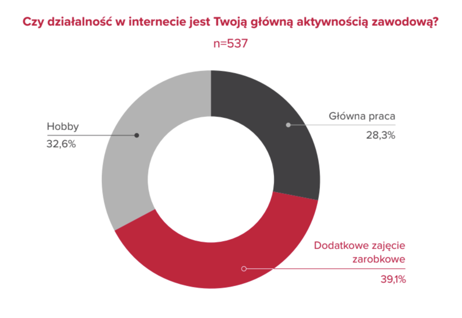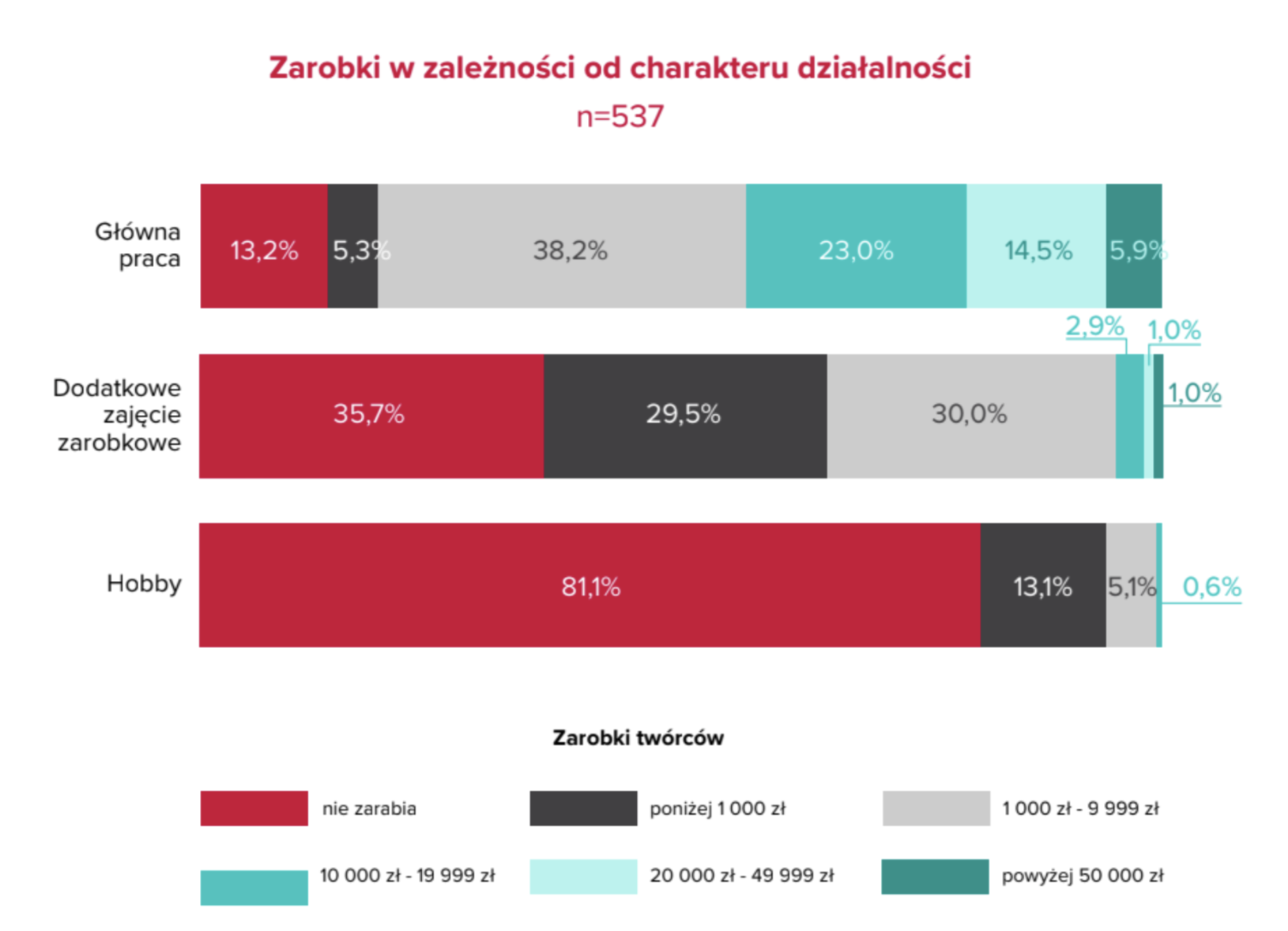 Wraz z profesjonalizacją rośnie też poziom zarobków. Twórcy zawodowi, którzy poświęcają na działalność online najwięcej czasu, osiągają zdecydowanie wyższe przychody. Aż 4 na 10 z nich zarabia miesięcznie ponad 10 tysięcy złotych. Dla porównania, podobny poziom dochodów osiąga około 5 proc. Dorabiających i mniej niż 1 proc. Hobbystów.