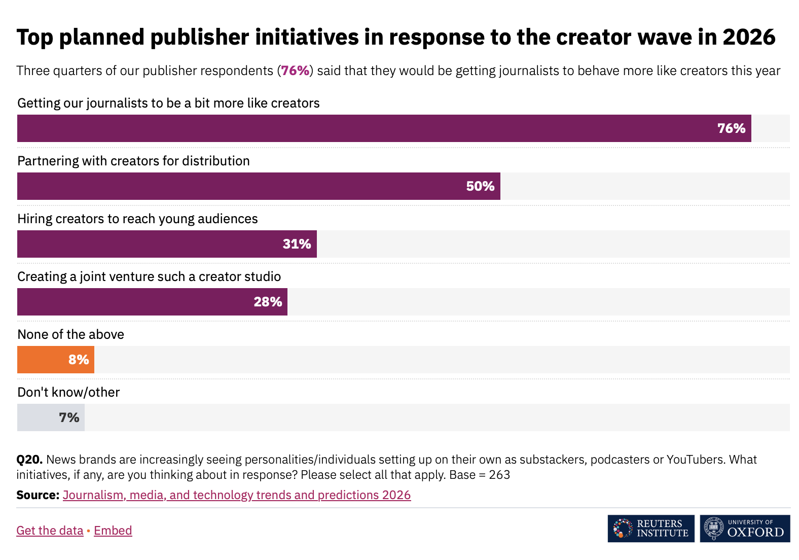 Opublikowany w styczniu raport Reuters Institute pokazuje, że media coraz wyraźniej przejmują sposób działania twórców internetowych. 76 proc. wydawców deklaruje, że oczekuje dziś od dziennikarzy sposobu pracy zbliżonego do tego prezentowanego przez twórców internetowych – budowania rozpoznawalności w mediach społecznościowych, tworzenia relacji z odbiorcą i własnych formatów. Równolegle redakcje rozwijają modele współpracy z twórcami, budując creator hubs i studia wspierające niezależne talenty oraz inwestując w długofalowe partnerstwa. CNN uruchomiło w Dosze studio tworzące treści dla młodszych odbiorców, holenderskie SPIL rozwija SPIL News z młodymi dziennikarzami publikującymi na TikToku i YouTube, a australijskie ABC News Loop produkuje krótkie materiały wideo, które dostarczają użytkownikom kontekst najważniejszych wydarzeń.